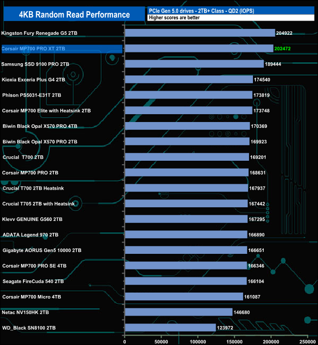 At QD1, the drive sits in third place behind WD's Black SN8100 and Kingston's Fury Renegade G5. At QD2, it moves up a place, and QD4 drops down to fourth. At QD32, the drive has moved back up into the second spot.