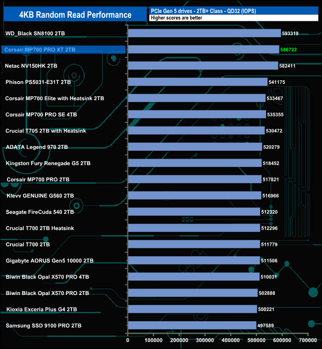Using our four-threaded 4K random read tests, we couldn't get close to the official maximum of 2,700K IOPS. The best figure we saw was 586,722 IOPS (2,403MB/s), coming at the end of the test run at QD32.