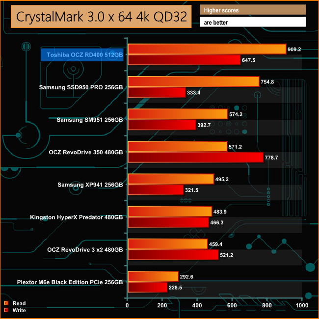 Apart from the extremely impressive sequential read/write speeds, the RD400 also handles deeper queue depths without any problems. At normal desktop queue depths the 4K random write 223.1MB/s is again very impressive but unfortunately the same can't be said for the read performance which is only on par with the faster standard 6Gb/s SATA SSD's.