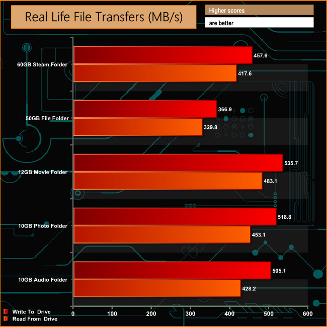 As you might expect the RD400 has no problems at all with data transfers to and from it. Writing a 60GB Steam folder to it took a mere 1m 46s and just over two minutes to copy it back.