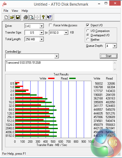 Tested with the ATTO benchmark, the 512GB SSD370S matches the official Transcend figure of 560MB/s for reads however the benchmark score of 442MB/s for writes is a little shy of the official 460MB/s.