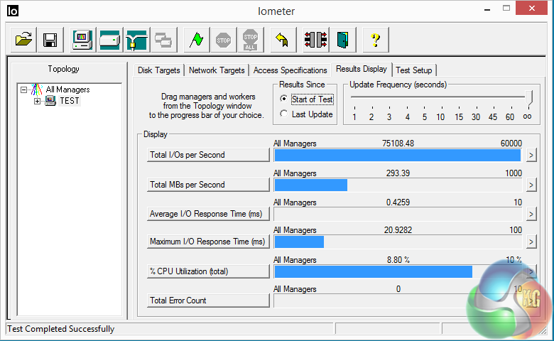 The impressive 4K write performance continues under the IOMeter benchmark, the drive producing a score of 75108 IOPS in the random read test, bang on the official number of 75000 IOPS. Once again the 4K read isn't quite as convincing producing 71710 IOPS, a little way off the official figure of 75K.