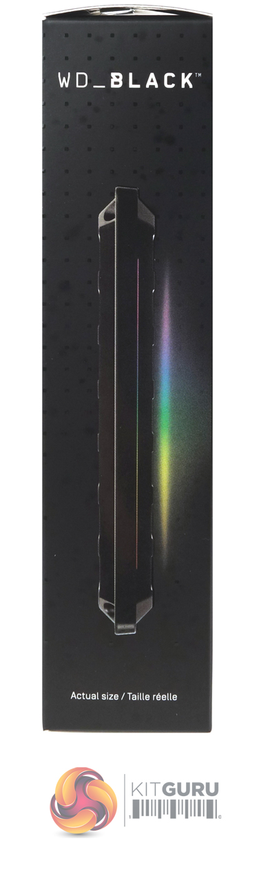 The WD Black P40 Game Drive comes in a sturdy box with an image of the drive on the front along with the regular WD Black branding. Under the right-hand side of the image, we see the drive’s capacity and read speed in both English and French.