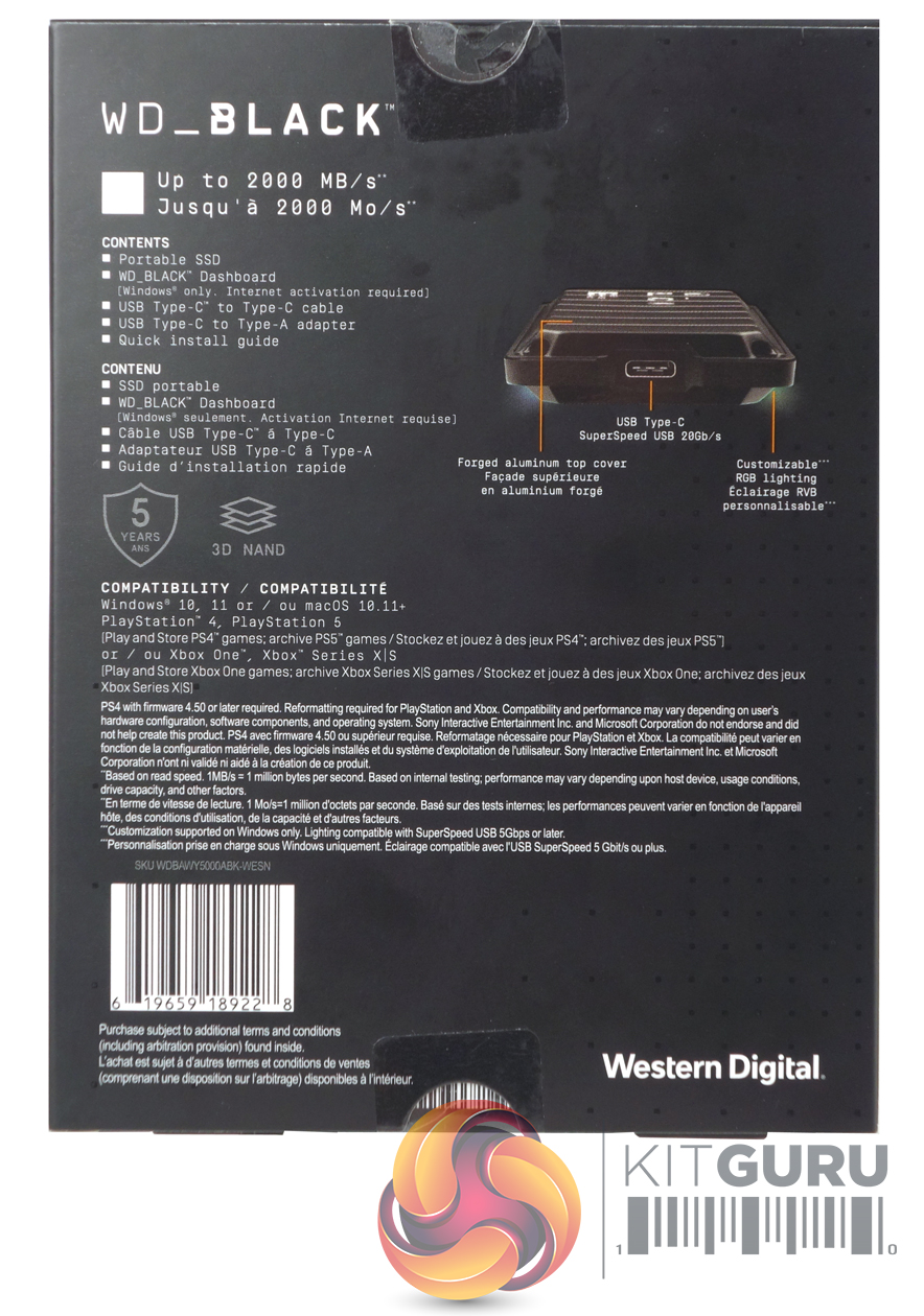 The back of the box has a small image of one end of the drive, the end that has the USB Type-C connector. To the left of this image is a box contents list and the drive compatibility options, again in both English and French along with logos informing users of the 5-year warranty and that the SSD inside the unit uses 3D NAND.
