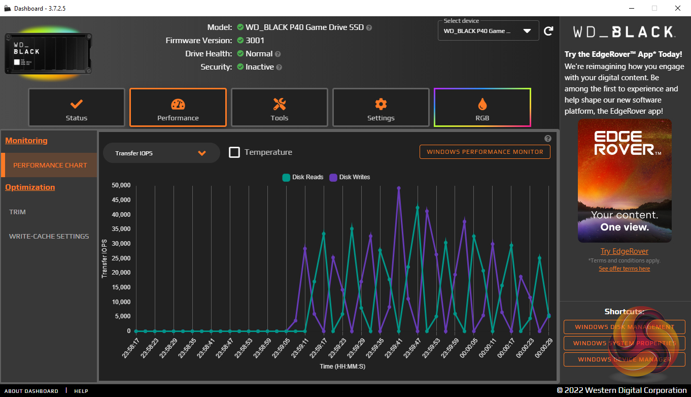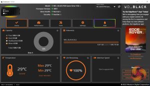 WD’s SSD Dashboard (v3.7.2.5 supports the Black P40 Game) is one of the best and about as comprehensive an SSD management utility as you’ll likely to find. It displays information on drive temperature, life remaining and a whole lot more including a live performance monitor. There isn’t any cloning utility incorporated into the dashboard but Acronis True Image WD Edition which can download from WD’s website.