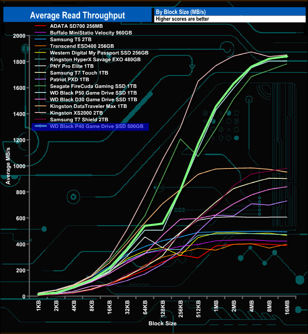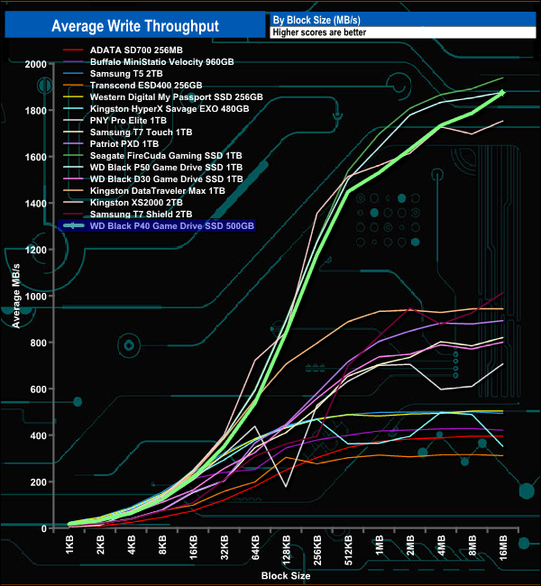 Although the peak read throughput result of 1,840.16MB/s is a little way off the official maximum figure, the 500GB WD Black P40 Game Drive is the second fastest drive we've seen to date when it comes to Sequential reads. Kingston's XS2000 drive sits in the top spot.