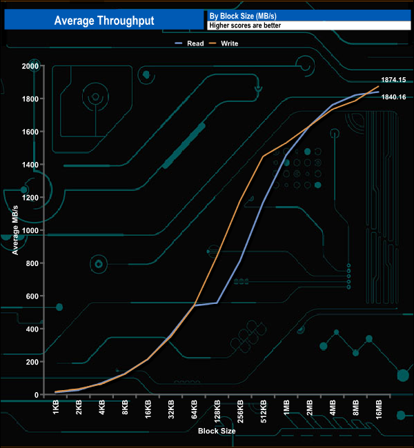 In our throughput tests both read and write performance peak at the end of the test (16MB block mark). Reads peak at 1,840.16MB/s while writes peak at 1,874.15MB/s, both figures are short of the official figures of 2,000MB/s reads and 1,950MB/s writes.
