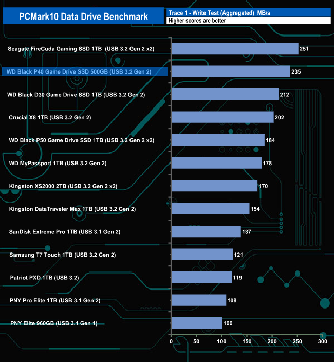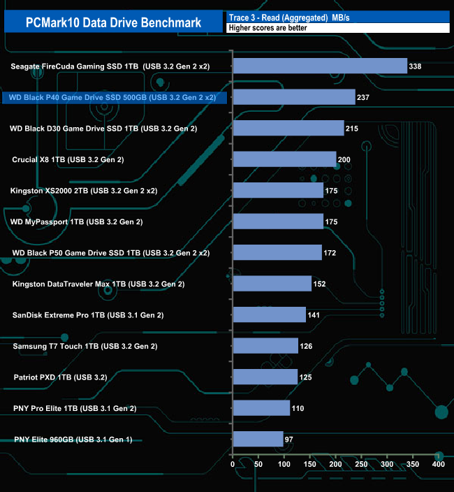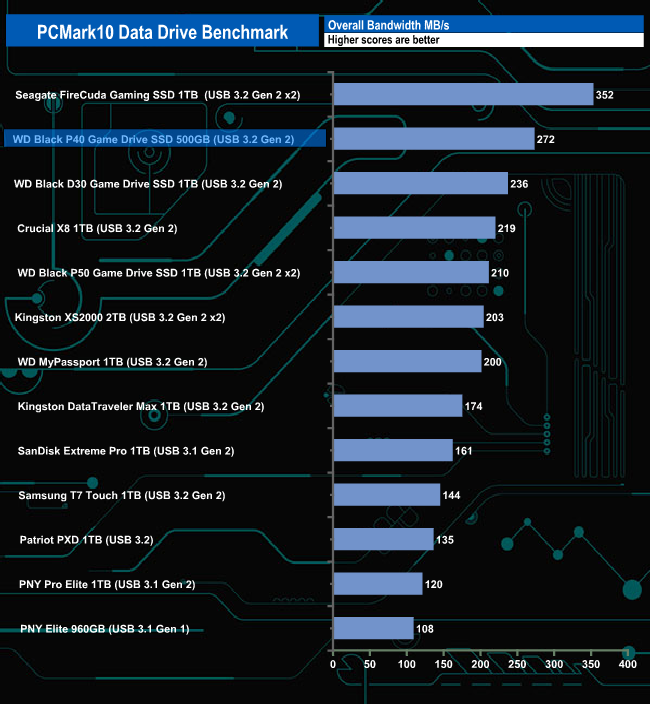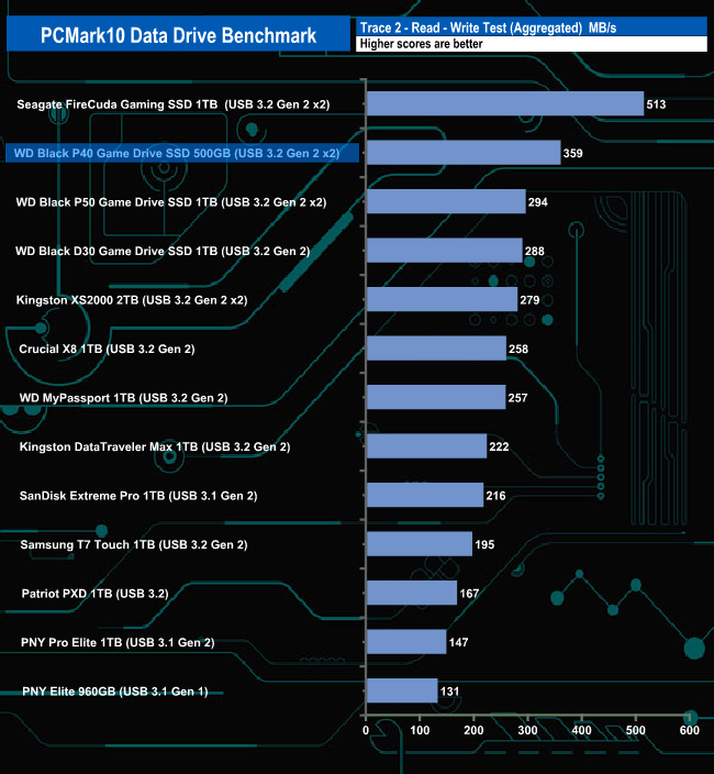 WD's Black P40 Game Drive handles the rigours of the PCMark 10 Data Drive Benchmark very well indeed. It's the second fastest USB 3.2 Gen 2 x 2 drive we've seen to date, beaten only by Seagate's FireCuda Gaming SSD in the overall bandwidth figure and all three test traces.