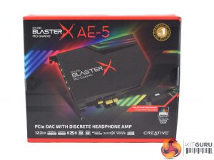 The Creative Sound BlasterX AE-5 ships in a black box with plenty of colourful accents spread across the front. A photo of the sound card itself is also splashed across the front of the box.