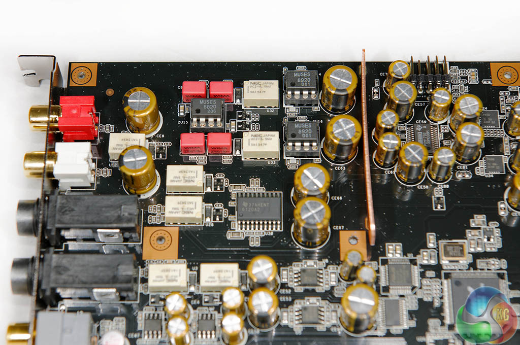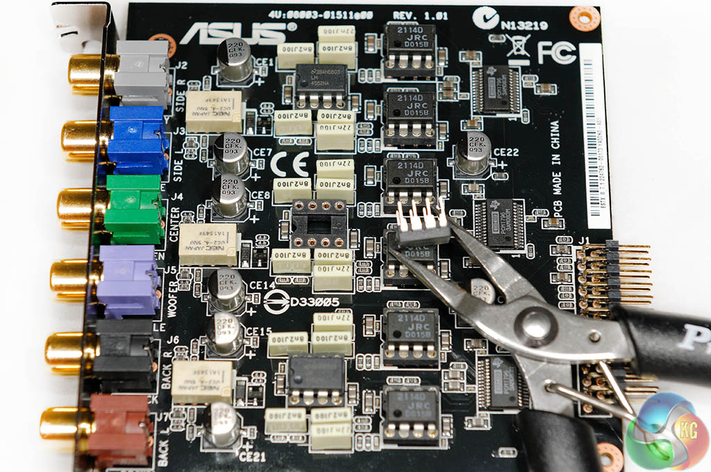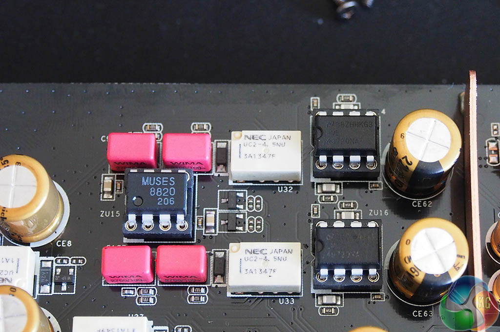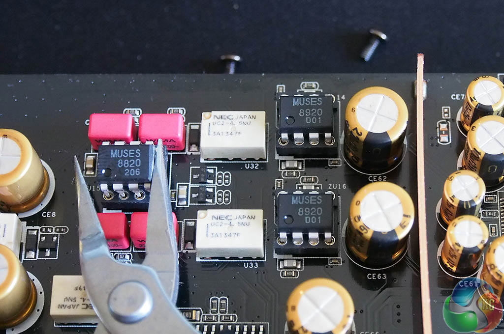 Interestingly ASUS have built in op-amp sockets – meaning that audiophile users can swap these out to change the sound signature. ASUS do supply an OP-AMP ‘swap kit', including the pliers to remove and fit. These are 2x LME 49720 and a single MUSES 8820.
