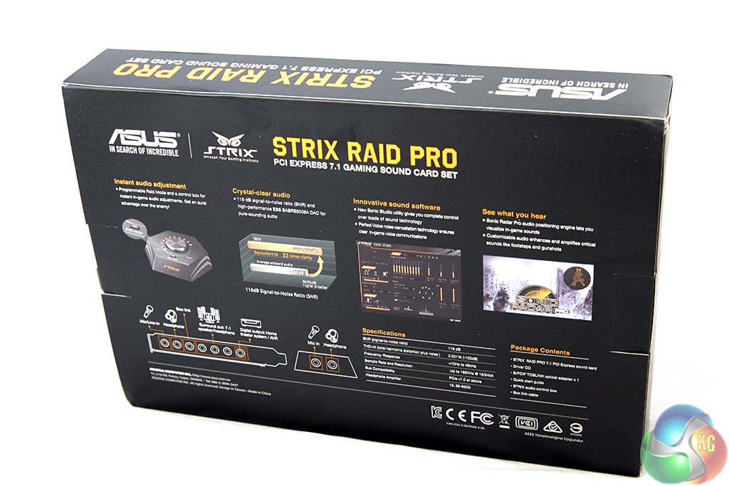 The rear of the box highlights various specifications including ‘instant audio adjustment' and ‘crystal clear audio'. Asus are keen to point out that they are using the ESS Sabre9006A DAC with a supported 116dB resolution. Underneath their graph they highlight ‘equivalent to 32 times clarity' which quite honestly seems somewhat meaningless to me.