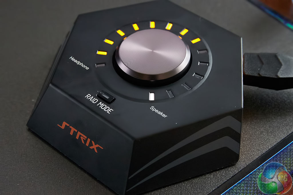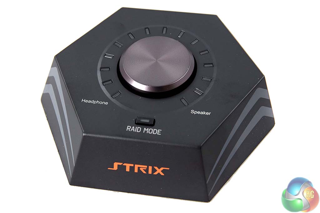 The Asus Strix volume control is a nice looking bit of kit that is meant to reside on your desk beside the keyboard. From here you can control volume and enable, or disable RAID Mode. The volume knob doubles up a a clickable switch to swap between headphone and speakers (if both are connected).