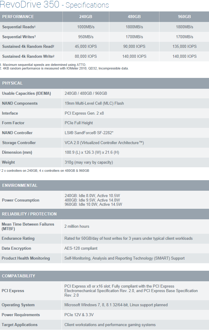 “The new RevoDrive 350 is built using proven technology with the added benefit of utilizing in-house premium Toshiba flash and OCZ’s proprietary Virtualized Controller Architecture (VCA) 2.0 to deliver highly efficient performance aggregation while reducing the burden on host resources,” said Daryl Lang, senior vice president of product management for OCZ Storage Solutions. “This next generation PCIe SSD is the ideal solution for performance-minded users looking to maximize both bandwidth and density for the complete gamut of gaming, content creation and workstation applications.”