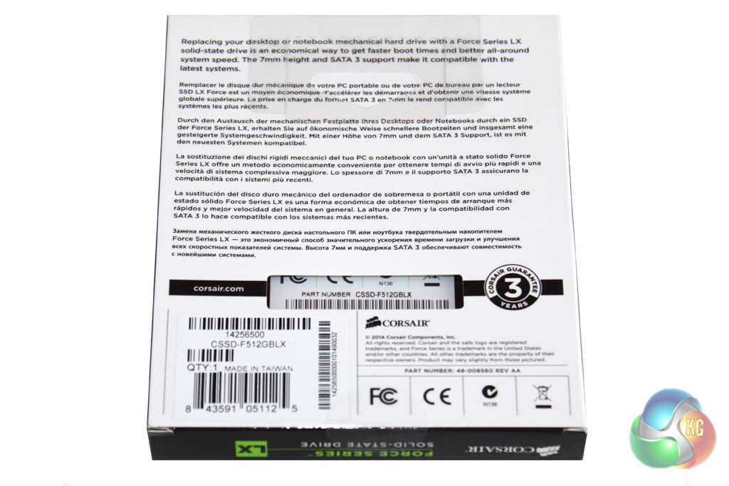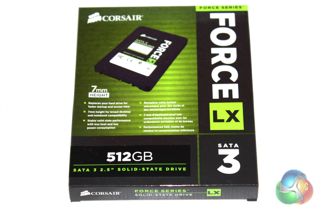 The Corsair Force LX is supplied in a small cardboard packet which is decorated in a green and black livery. The front of the packet features an image of the drive as well as a basic breakdown of the product’s features.