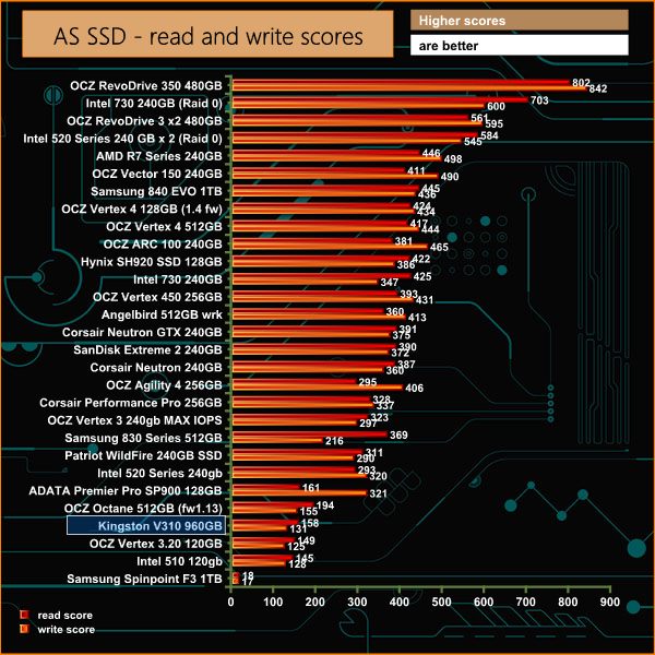 AS SSD only deals with incompressible data and we can see that this drive suffers dramatically. This is actually one of the worst results we have seen in recent years due to very weak 4k performance – dropping the overall score to 364 points. The Sandforce 3 powered AMD R7 SSD which we reviewed earlier this week scored almost 1,200 points, by comparison.