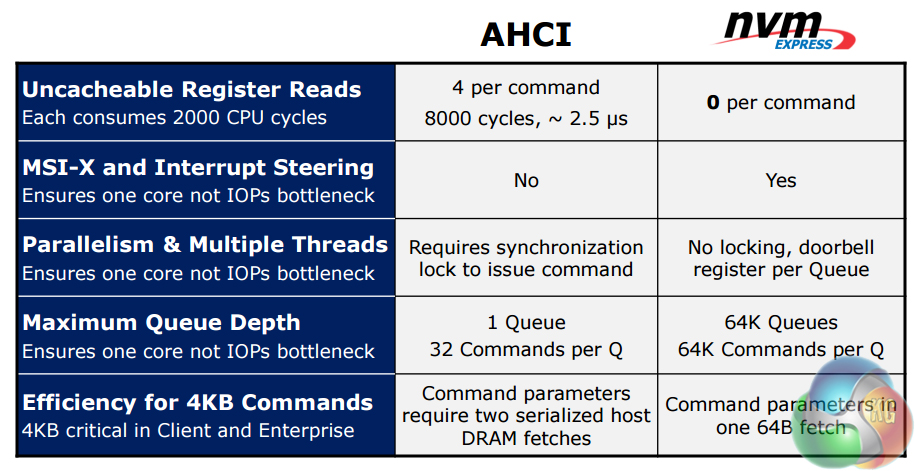 The Advanced Host Controller Interface (AHCI) specification used with basically all consumer SSDs (and HDDs) was around long before solid-state storage became popular on the consumer market. It was designed with the operational characteristics of mechanical storage in focus, so is not particularly optimised to take advantage of solid-state storage technologies.