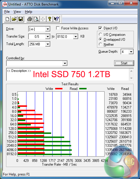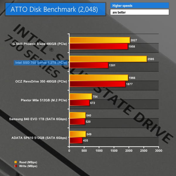 ATTO shows off the SSD 750 1.2TB variant's strong sequential read numbers. This is important to users who are regularly transferring large files from the drive – perhaps in a video editing environment with the content is shifted off the SSD onto a backup RAID array solution.