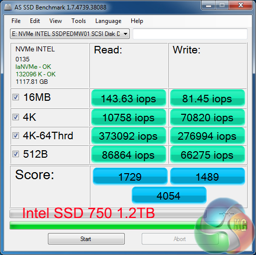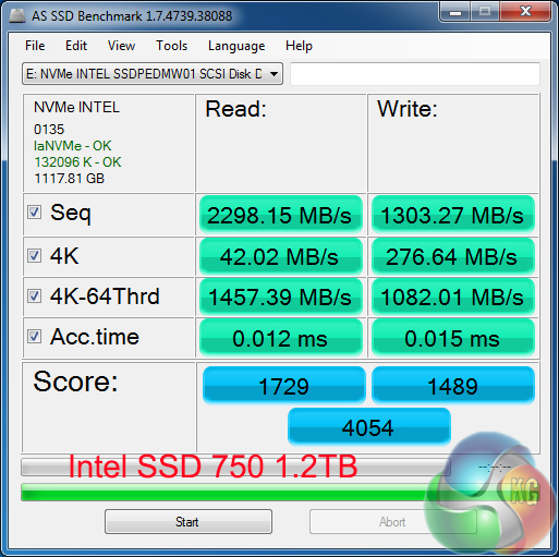 Another set of impressive performance numbers is set forward by Intel's SSD 750. Sequential read performance lingers around the 2.3GBps-mark, while AS SSD reports more than 370,000 IOPS for its 4K-64Thrd read test.