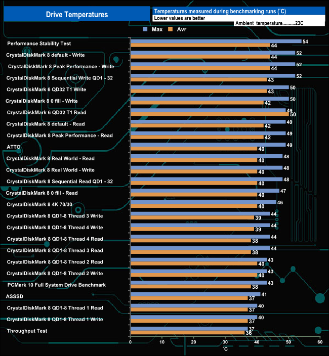 We took note of the drive’s temperature during some of our benchmarking runs. The label on the rear of the drive has a layer of copper under it to help with dissipating the heat the drive generates. The hottest the drive got was 54° C (with a 23° C ambient temperature) during the Performance Stability test, a test that really does push the drive hard.