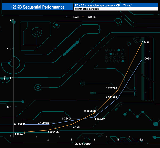 At QD1 the drive sits at the bottom of the Sequential read results chart, but as the tested queue depths deepen the drive's performance improves in relation to the drives around it in the chart.
