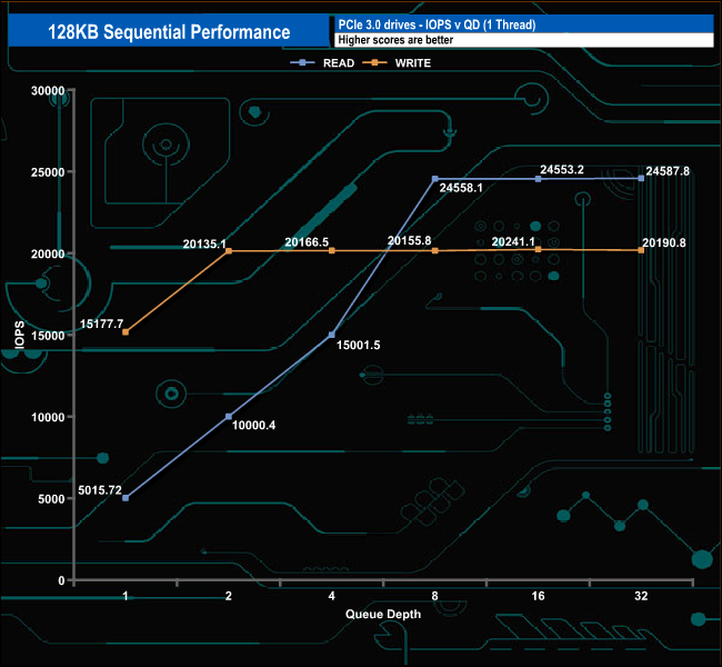 Transfer Request Size: 128KB, Thread(s): 1, Outstanding I/O: 1-32.