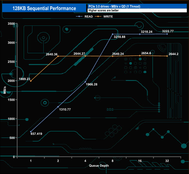 In our own Sequential performance testing, we fell just short of the 3,300MB/s read and 2,700MB/s official maximum speeds for the drive. The peak write figure of 2,654MB/s (QD16) was closer to the official figure than the 3,222MB/s (QD32) read result.