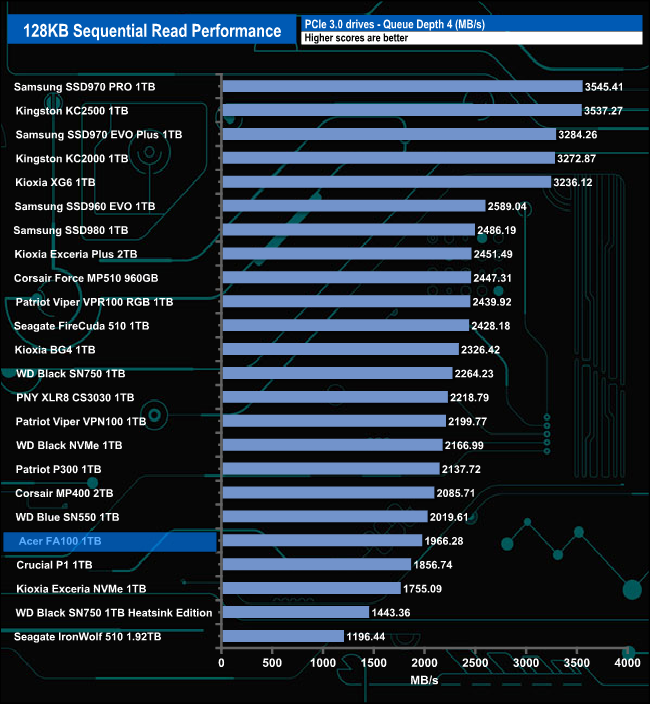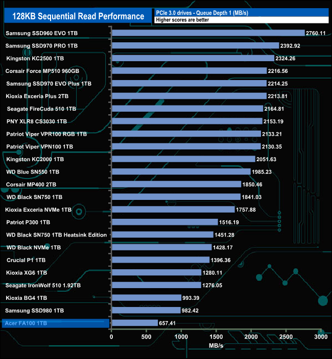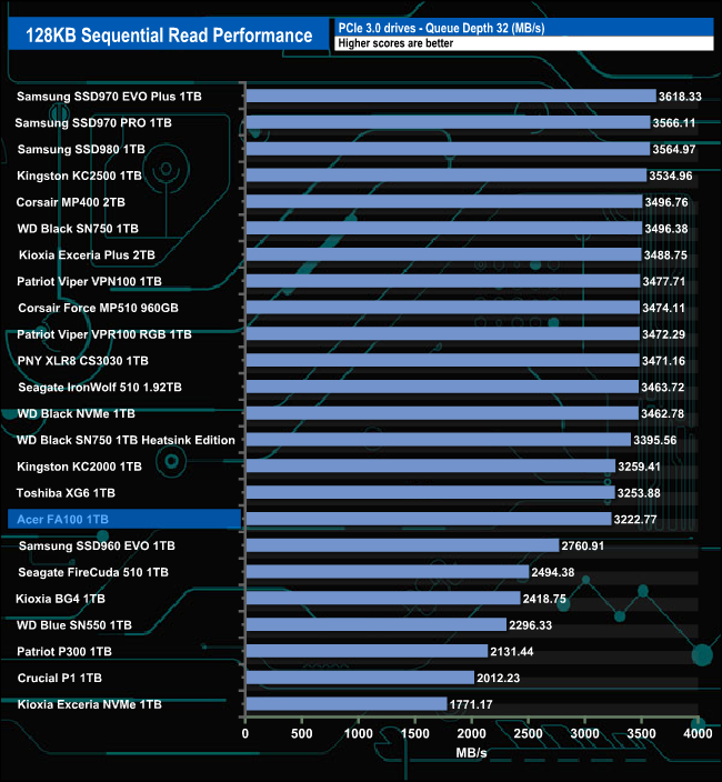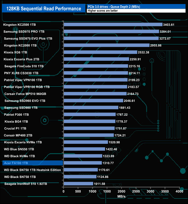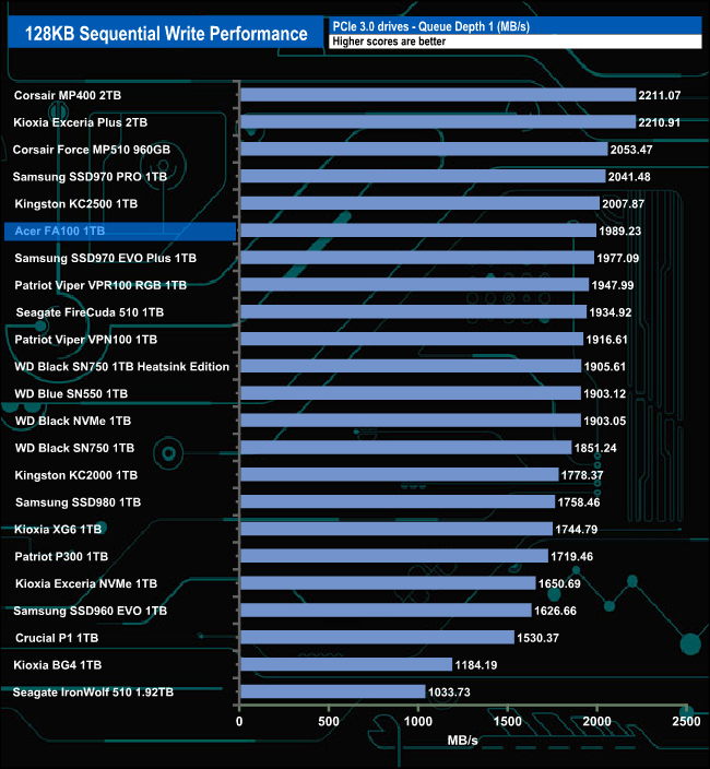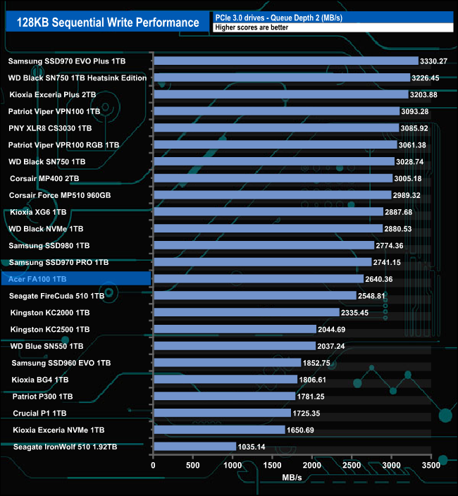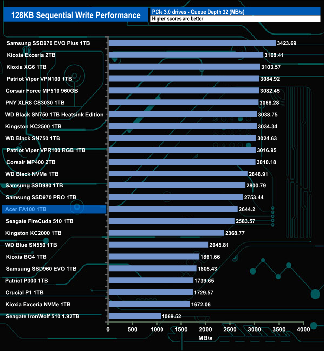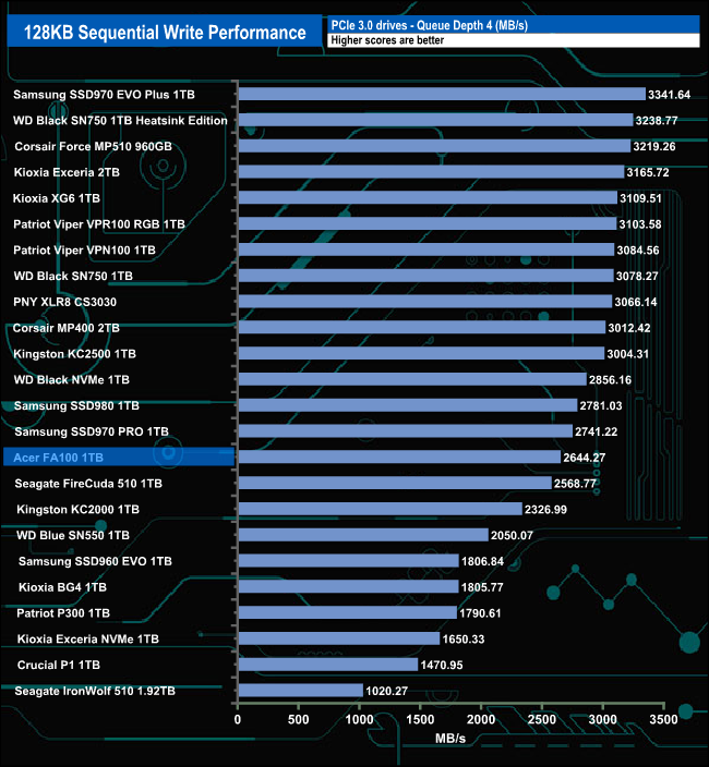 Whereas the read performance of the FA100 improves in relation to the drives around it as the tested queue depth deepens, when it comes to Sequential writes the opposite is true. At QD1 the drive sits in the top10 of drives tested but by QD32 it's in the bottom half of the results chart.