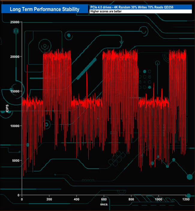 For the long term performance stability test, we set the drive up to run a 20-minute 4K random test with a 30% write, 70% read split, at a Queue Depth of 256 over the entire disk. The 1.92TB Acer SA100 averaged 15,340 IOPS for the test with a performance stability of 73%.