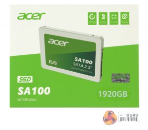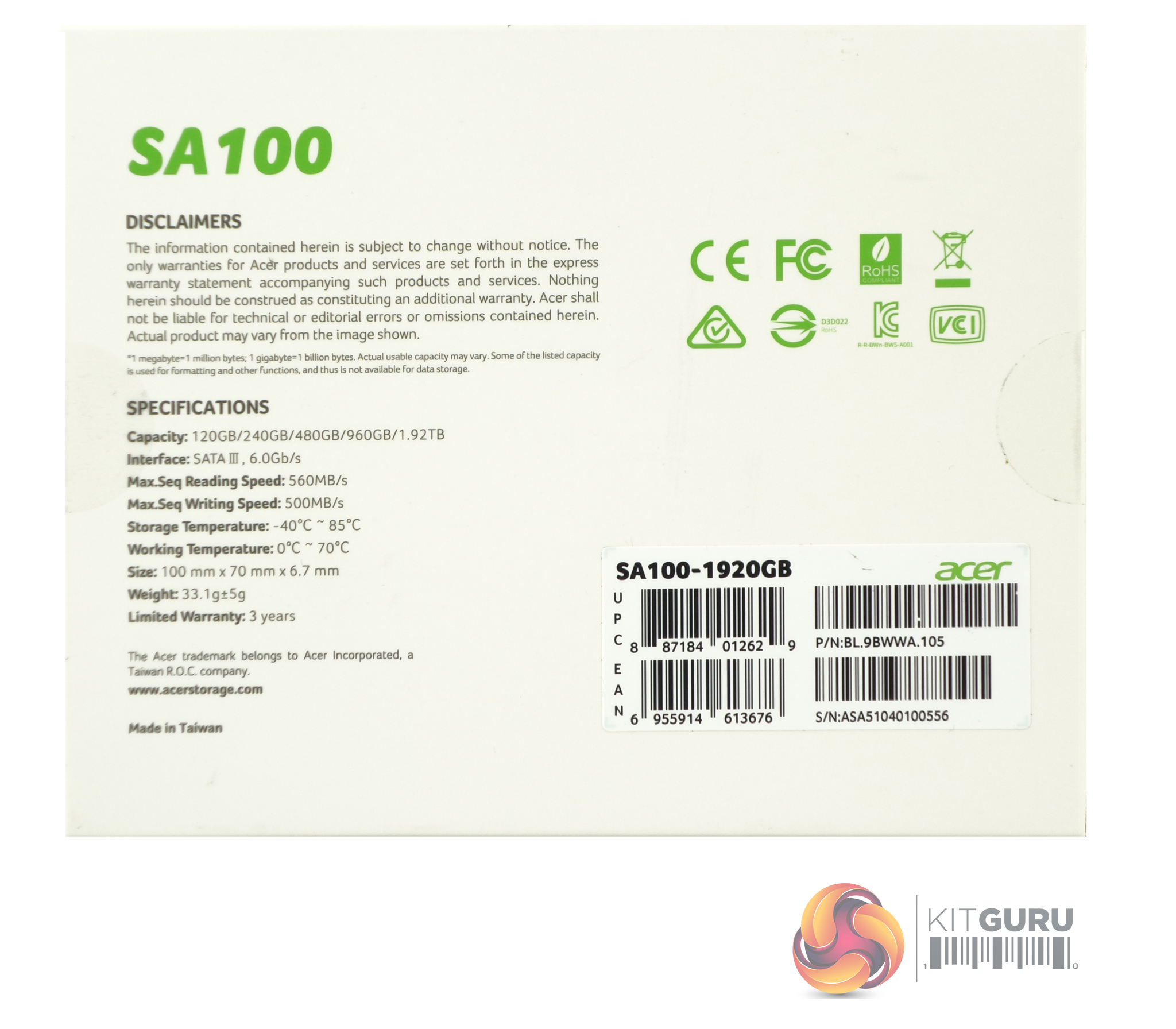Acer's SA100 drive comes in a compact box with an image of the drive on the front below which is a sticker carrying the drive's capacity. Above the image are four icons representing enhanced performance, the fact that the drive comes with a 3-year warranty, that it's lightweight and it comes with free cloning software (by downloading Acronis True Image OEM from the Acer website). The rear of the box has a small list of the drive specifications.
