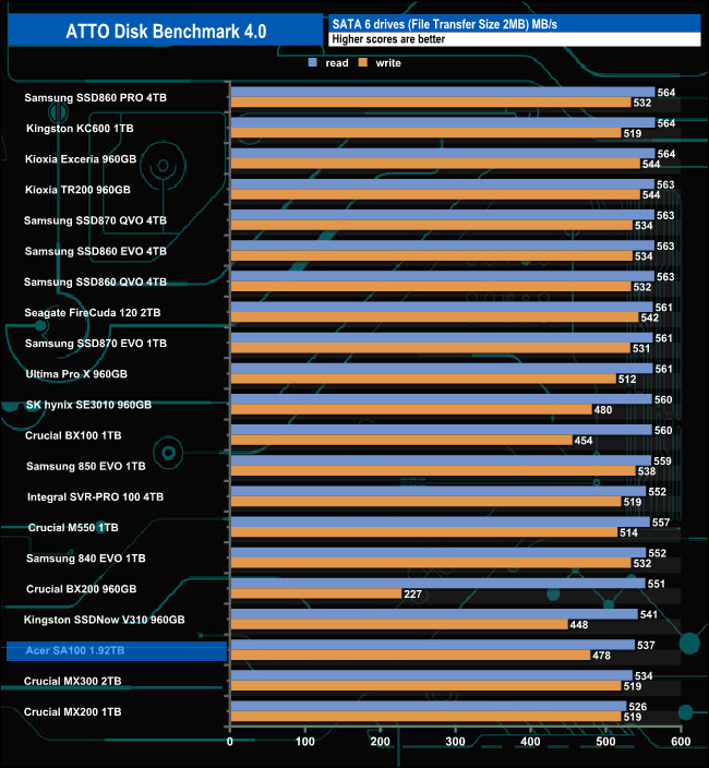 With the ATTO benchmark, we couldn't reach the official Sequential maximums for either reads (560MB/s) or writes (508MB/s) with benchmark scores of 537MB/s and 478MB/s for reads and writes respectively.