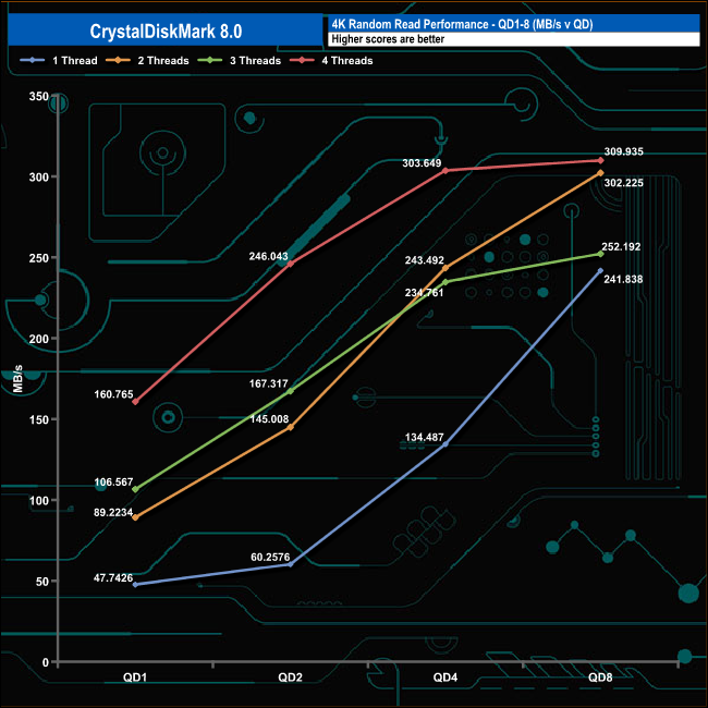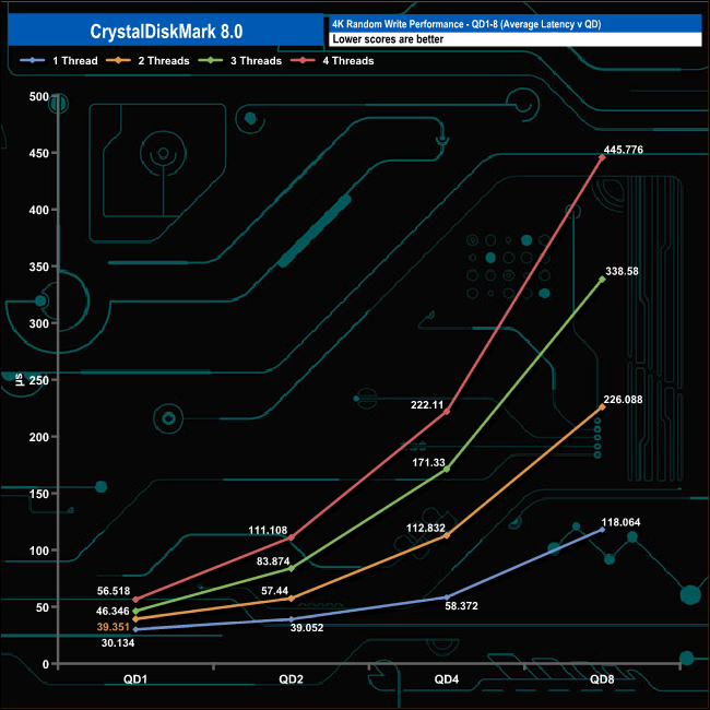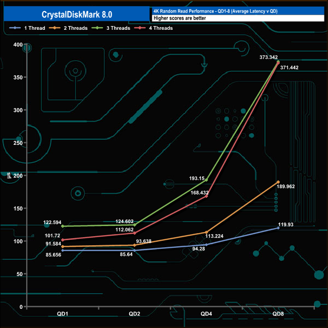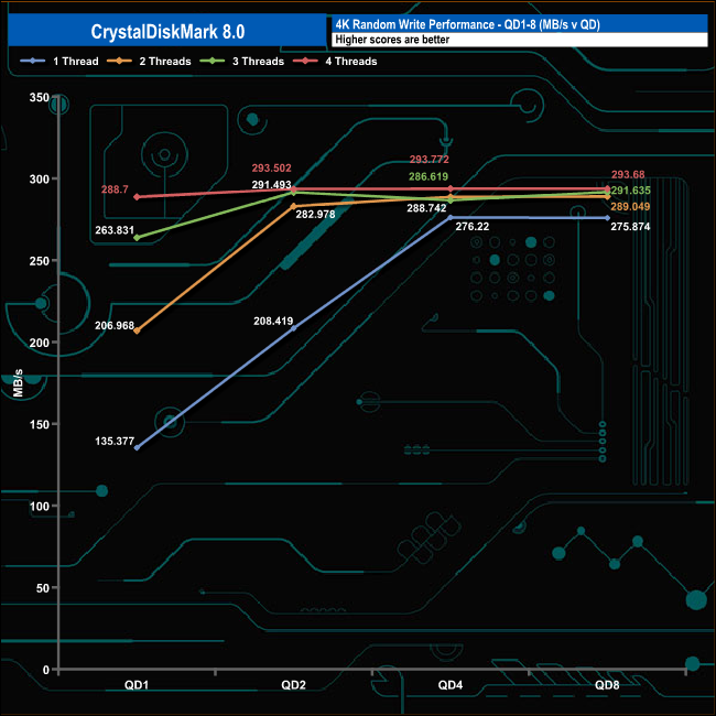 We also used CrystalDiskMark 8 to test the random performance of the drive at lower queue depths (QD1 – QD8 where most of the everyday workloads occur) using 1 to 4 threads.
