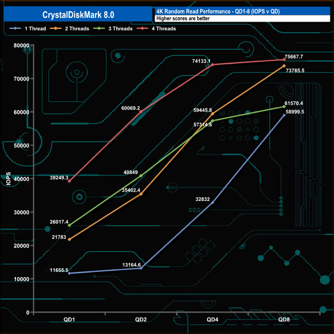 Using 2, 3 and 4 threads the drive produced figures of 61,570 IOPS (252MB/s), 73,785 IOPS (302MB/s) and 75,667 IOPS (309MB/s) respectively at a QD of 8.