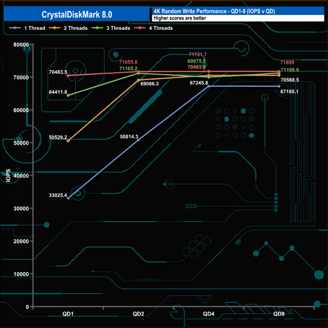 In the write tests, the drive peaks at QD4 (67,245 IOPS) using a single thread before falling back slightly to finish the test run 67,185 IOPS. When tested using 2, 3 and 4-threads there is a marked difference in performance at QD1 but by QD4 the performance of the threads is very much closer with the spread of results going from the slowest 67,245 IOPS (2 threads) to 71,721 IOPS (4 threads), a trend that continues to the end of the test run.