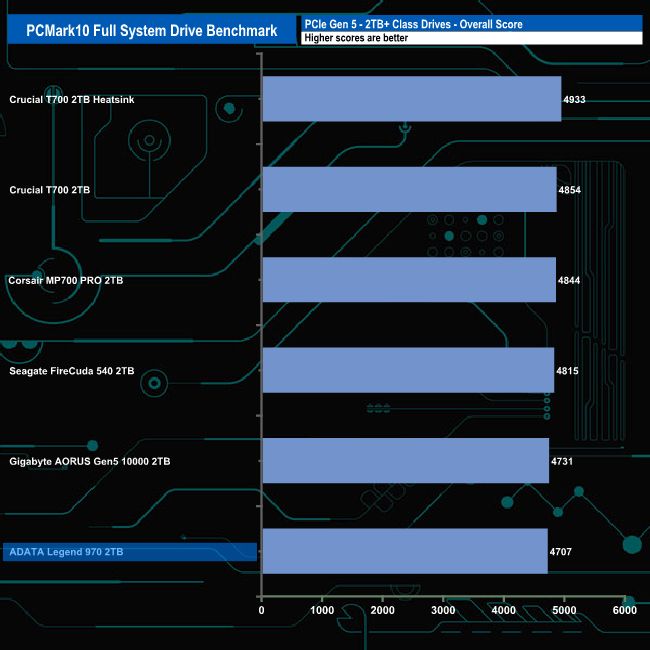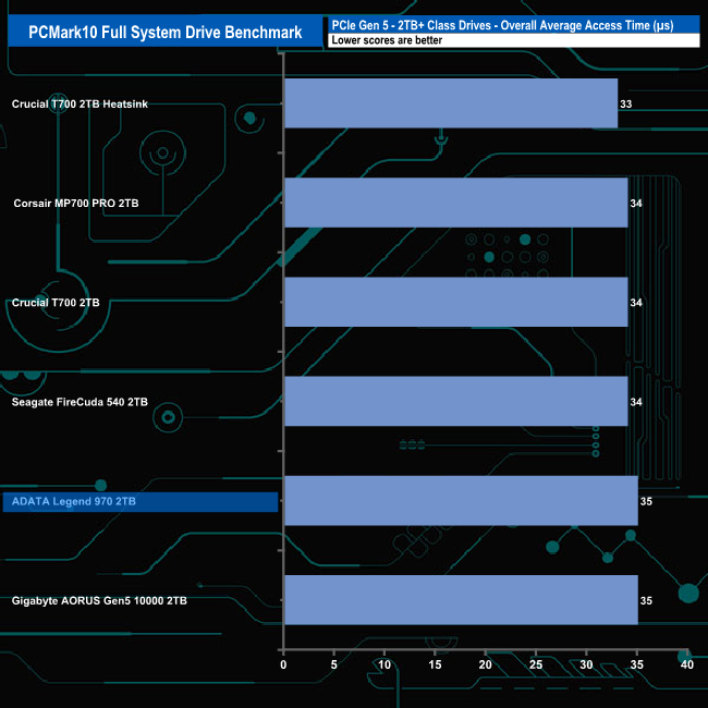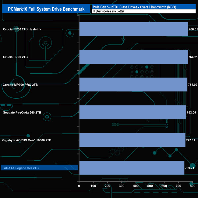 With an overall bandwidth figure of 739.71MB/s, the Legend 970 sits in last place in the results chart but there isn't much to choose between all the drives really as only 26MB/s separates the fastest drive from the slowest.