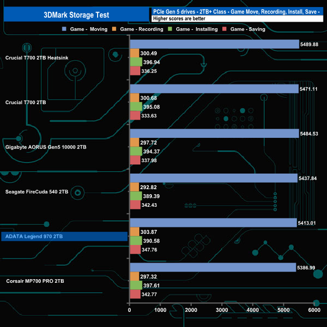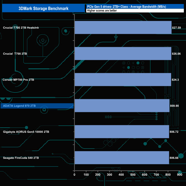 The 2TB Legend 970 averaged 824.3MB/s for the benchmark run which puts it in a mid-point spot in the results chart.