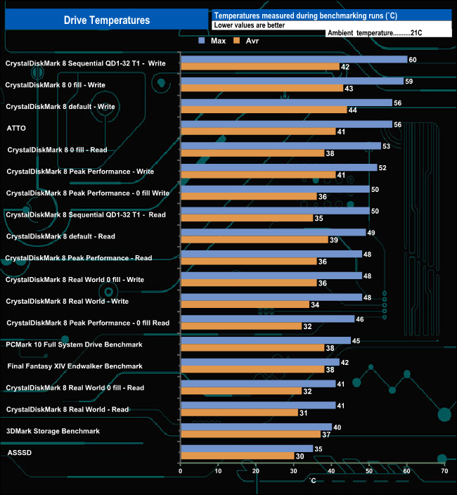 ADATA's Legend 970 not only has a chunky aluminium heatsink but for extra cooling, it has a tiny built-in fan. On top of that the cooling fins have had a surface crystallization treatment to increase the overall air contact area. The combination works well although you can hear the fan from time to time, it's certainly not a wailing banshee that some tiny fans tend to be. During our benchmarking runs, the hottest the drive got was 60° C during the CrystalDiskMark 8 default write test. It averaged 48.3° C for the non-4K tests.