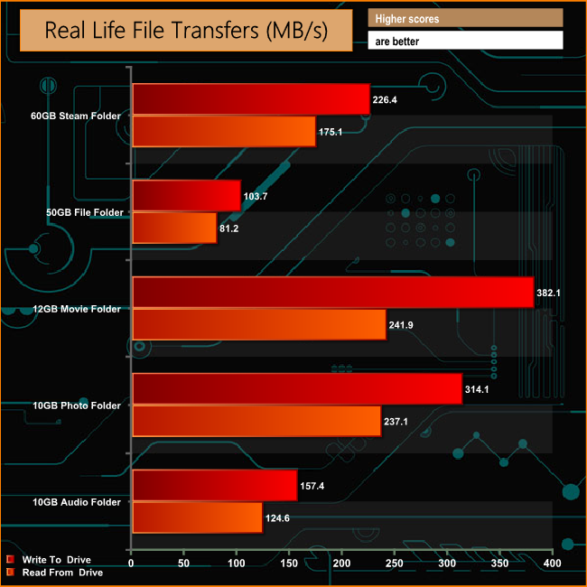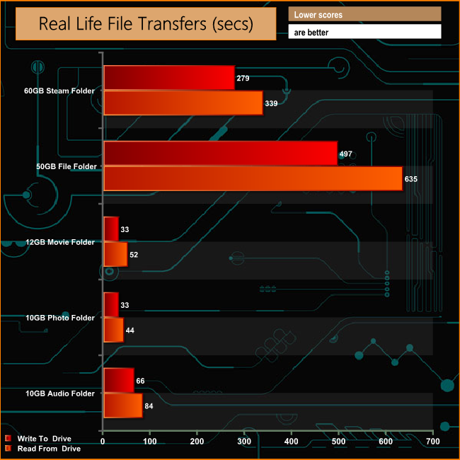 As you might expect from a drive using a SSD, the SD700 sailed through the real life transfer test, dropping below 100MB/s just once, reading the very small files of the 50GB file folder.