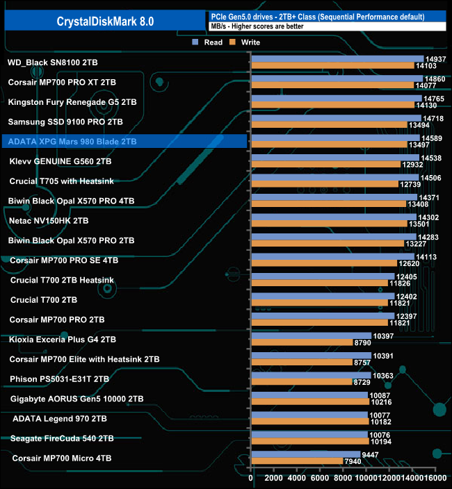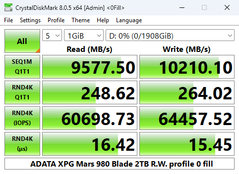 As you can see from the benchmark result screens, we can confirm the official Sequential read/write figures for the 2TB XPG Mars 980 Blade and better them a little. At 14,589MB/s, the read result is a 589MB/s improvement over the official figure, while the write result of 13,497MB/s shows a 497MB/s bettering over the official figure.