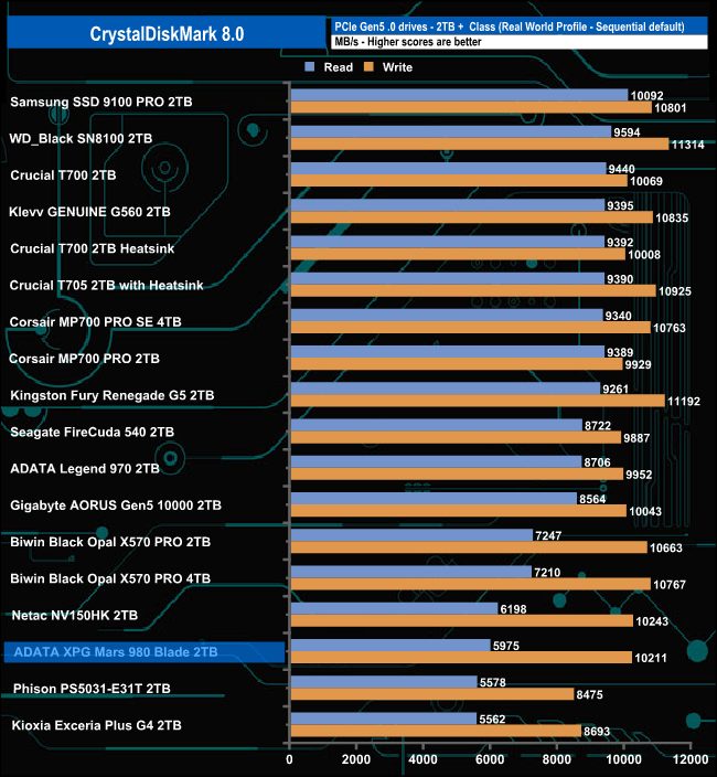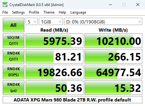 In CrystalDiskMark 8's 4K QD1 T1 test, the ADATA XPG Mars 980 Blade 2TB sits at the bottom of the table with a read result of 81.37MB/s backed up with a write score of 264.12MB/s, the read figure just short of the previous generation ADATA Legend 970 read performance. The write performance of the Mars 980, however, is a fair bit slower than the Legend 970.