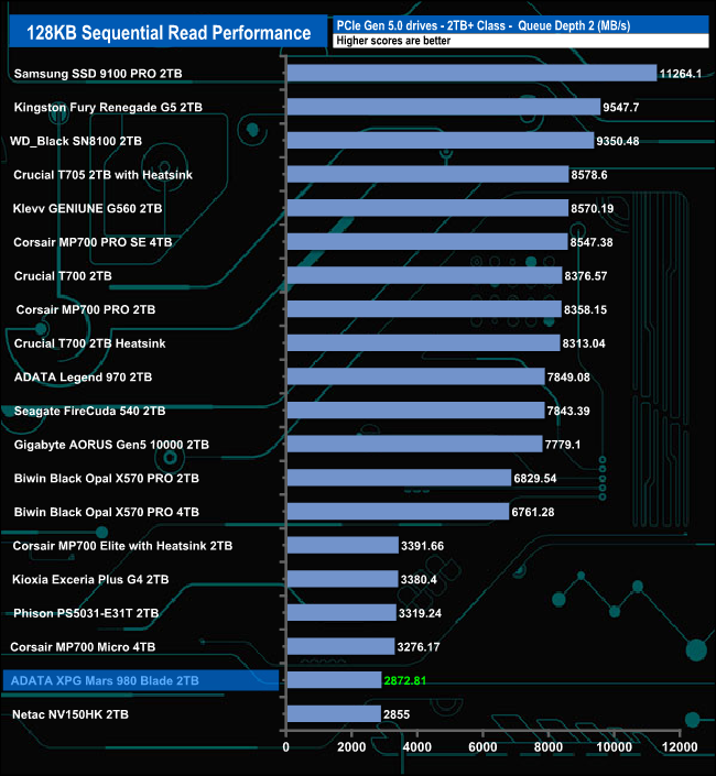 At QDs 1 & 4, the ADATA XPG Mars 980 Blade sits in the lower half of the results chart; at QD4, it sits in last place. However, at QDs 2 and 32, the drive sits in the top 5 of the charts.