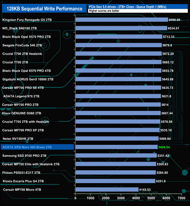 The best performance from the XPG Mars 980 Blade came at QD32; its score of 14,578.3MB/s puts it into fifth position in the results chart.