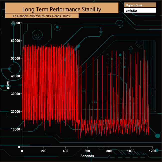 For the long term performance stability test, we set the drive up to run a 20-minute 4K random test with a 30% write, 70% read split, at a Queue Depth of 256 over the entire disk. The SX950 240GB drive averaged 23,813 IOPS for the test with a performance stability of 41.9%.