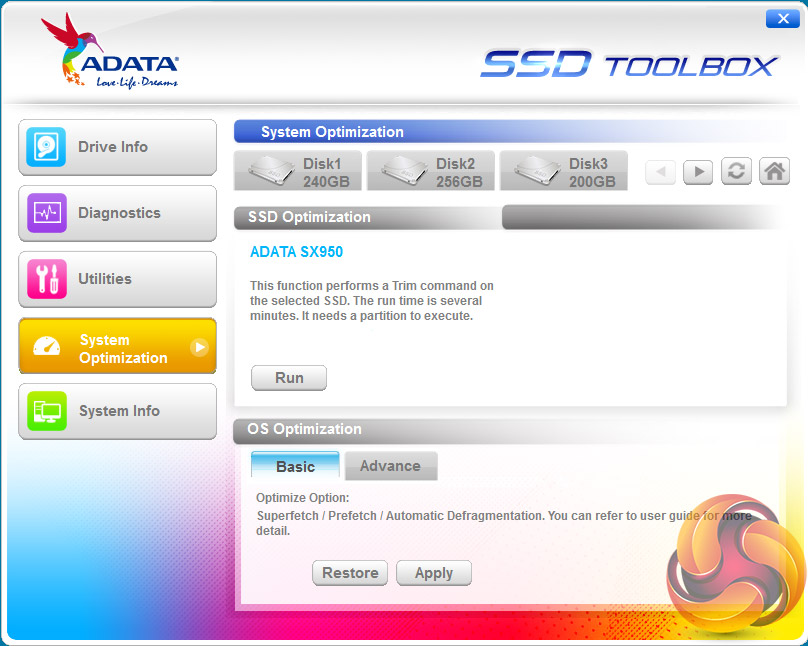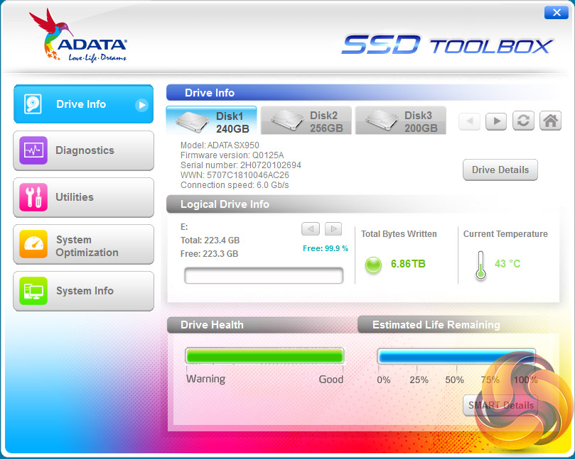 ADATA's management utility for their SSD's is called the SSD Toolbox and it certainly catches the eye as it's about the most colourful looking utility out there. The drive info page displays information about how much capacity is being used and the TBW number.