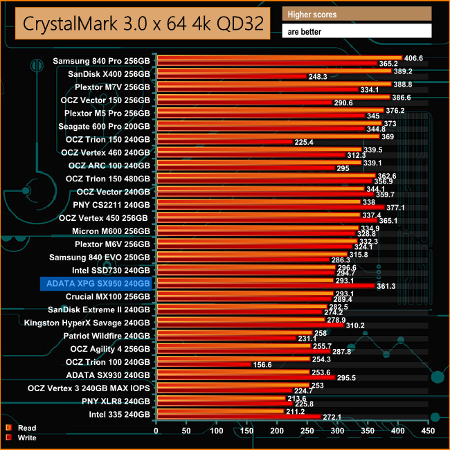 The SX950 handles writing small files at deepish queue depths very well, much better than its read performance. It's the same story at a queue depth of 1 as well. Looking at the two benchmark results screens it appears the Silicon Motion SM2258 controller doesn't care what type of data it's being asked to work with.
