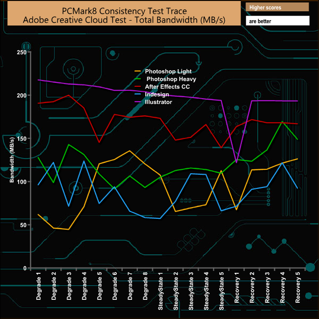 PCMark 8’s Consistency test provides a huge amount of performance data, so here we’ve looked a little closer at how the ADATA XPG SX950 240GB drive performs in each of the benchmarks test suites.