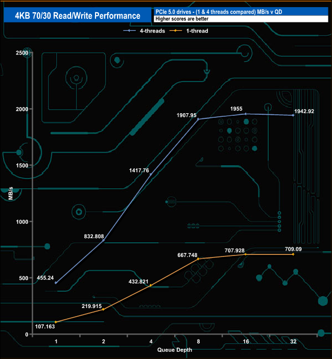 We used CrystalDiskMark 8’s custom settings to test the 4K 70/30 mixed read/write performance of the drive through a range of queue depths using a single thread and four threads.