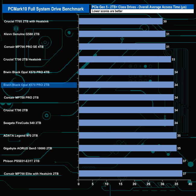 When tested with the Adobe usage traces, the 2TB X570 PRO averaged 682.6MB/s for the five tests, which includes the 1,425MB/s result for the Adobe Photoshop heavy usage trace. The slowest of the five traces was the InDesign trace at 290MB/s