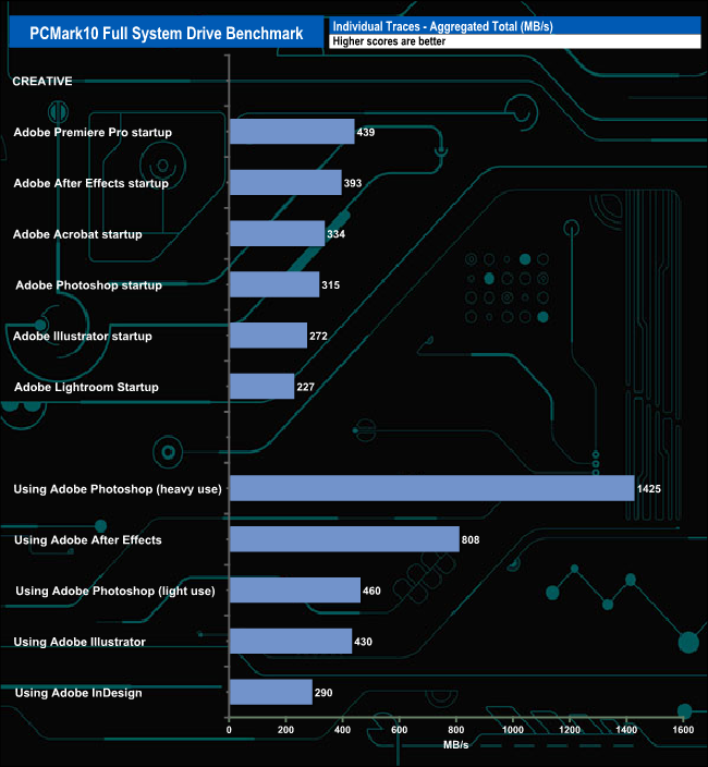 The drive averaged 330MB/s for the six Adobe startup traces, the fastest being 439MB/s for the Premiere Pro startup test with the slowest being the 227MB/s using the Lightroom startup test trace.