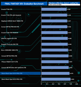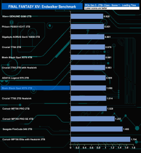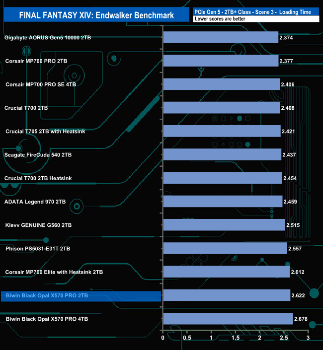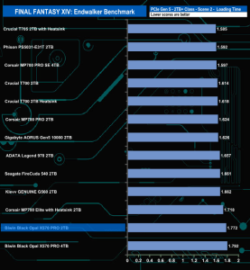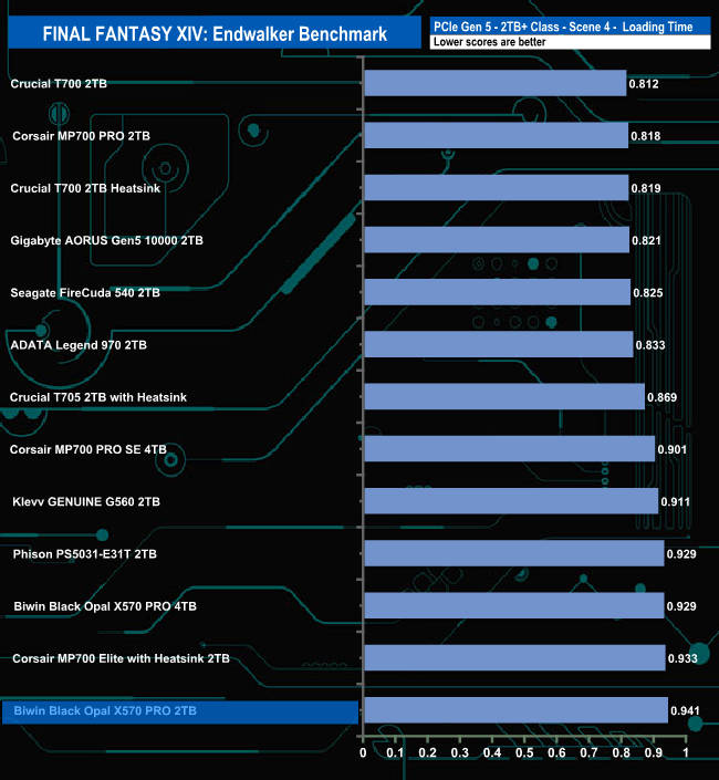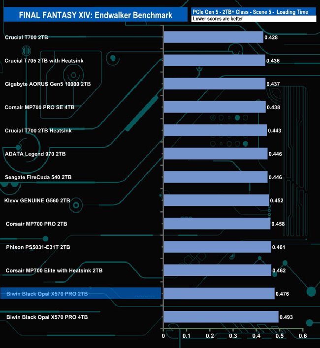 Just like the 4TB version, the 2TB X570 PRO doesn't seem to handle the Final Fantasy XIV Endwalker Official Benchmark particularly well as it ends up in the lower half of the overall results chart. The drive appears to handle the Load Scene 1 test the best out of the five traces.