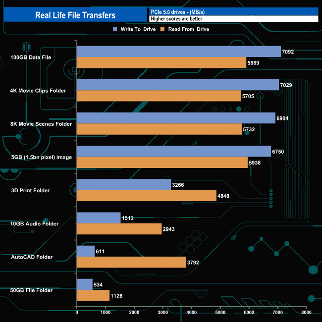 The 2TB Biwin Black Opal X570 PRO averaged 4,135MB when writing the 8 transfer tests, with the fastest being the 7,092MB/s (15sec) for the 100GB Data file with the slowest being the 50GB File Folder transfer at 534MB/s (101sec). Reading back the data, the average was 4,496MB/s with the 100GB Data file again being the fastest at 5,889MB/s (18sec).